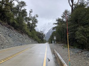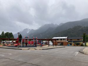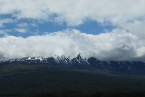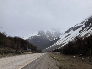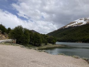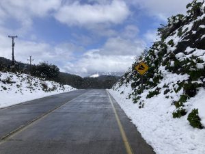 Um 10 Uhr sah die Regenwahrscheinlichkeit gering genug aus, um loszufahren. Mehr als 10 Grad waren heute nicht drin, und zweimal habe ich Regenjacke und -hose übergestreift. Die Gegend ist etwas sanfter als der NP Pumalin, alle paar km war ein Haus zu sehen. Strasse war perfekt, nur einmal kam viel Verkehr (war wohl eine Fähre nach Chaiten). Zwei Radler hab ich überholt, der Holländer kam 100 Minuten später an. Ab km 60 gab es einen ordentlichen Anstieg und 7km später auf dem Pass auf 650m Schnee. Runter nach Villa Santa Lucia ging flott, für die 75km mit Pausen gerade mal 5 Stunden.