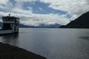 Da gestern Abend bei der Buchung der Fähre der Platz für Fahrzeuge ausgebucht war, konnte ich mein Rad nicht anmelden. Also habe ich morgens am Anleger gleich den ersten leeren Pickup (bzw. dessen Fahrerin) gefragt, ob ich mein Rad einladen dürfe. War kein Problem, also konnte ich beruhigt frühstücken. Danach waren es sogar 3, ein belgisches Paar hatte dieselbe Idee. Am Ende hätten die Räder auch Platz auf der Fähre gefunden, nur Autos nicht mehr. Die erste Fahrt dauerte fast 3 Stunden, dann folgten 10km über Land, anschliessend nochmal 1 Stunde. Zwischendrin gibts einen Bus, der auch Räder mitnimmt, die zweite Fähre wartet nämlich nicht. Ich hab mein Rad in Caleta Gonzales abgeladen, die Belgier waren so schlau, sich noch ein Stück mitnehmen zu lassen. Die ersten 8km waren übler Schotter, wohl auch witterungsbedingt mit einigen Baustellen. Dann wurde der Schotter besser und prompt habe ich mir bei einer Abfahrt einen Durchschlag eingefangen. Beim Schlauchwechsel haben 2 deutsche Radler angehalten, die in Lima gestartet sind. Dann gings weiter, kurz nach dem Parkplatz zum Vulkan Chaiten gabs sogar Asphalt. Eigentlich wollte ich hier einen Wandertag einlegen, aber die Wettervorhersage verhiess nichts gutes, sondern ab der Nacht und morgen 10l Regen und Sturm. Also bin ich auf der dann guten Strasse die vollen 57km bis Chaiten geradelt. Im letzten Licht und vor dem ersten Schauer hab ich das Dorf erreicht. Der zufällig gewählte Campingplatz sah zwar erstmal nicht so prickelnd aus, aber die Möglichkeit, das Zelt im Schutzhaus aufzubauen, hat mich überzeugt, die nächsten beiden Tage hier zu verbringen.