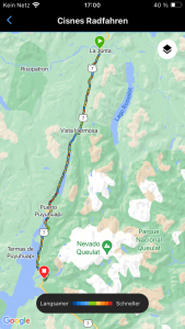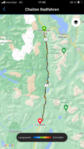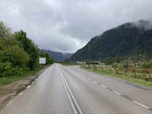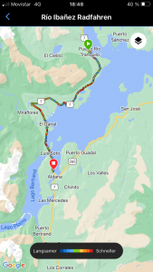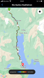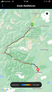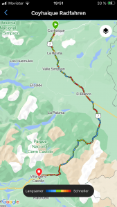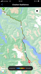 Von der Carretera Austral habe ich jetzt die Hälfte hinter mir. Die zweite Hälfte könnte anstrengender werden, weil dann Schotterstrasse die Regel ist (Komoot sagt 152km loser Untergrund und 283km fester Kies) und es noch einsamer wird. Der grösste Anstieg kommt aber schon morgen, ggf. zelte ich auf 1100m. Da gibts dann wohl auch kein Internet.