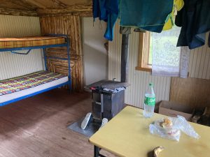 Nachts war ein ziemlicher Sturm, morgens hat dann der Strom gefehlt. Ein Wetterumschwung war das leider nicht, bei der Abfahrt gegen 9:30 hab ich wieder Regenzeug angelegt. Nach 13km war dann endgültig der Asphalt zu Ende und es begann eine üble Rüttelpiste, die dann auch wieder bergan ging. Der Wind kam leider auch öfters von vorn. Bei km 53 hab ich wieder einen Platten hinten gehabt, Reparatur ging trotz Regen und kalter Finger. Ab da war ich bereit für den nächstbesten Campingplatz, bloss nicht weiter auf der üblen Strasse im Regen. Da mein Garmin nicht mehr regendicht und die Streckenübersicht auf der Uhr zu umständlich ist, war ich überrascht, dass 2km weiter der Pass erreicht war und es auf einer deutlich besseren Piste nur noch bergab ging. So war ich am Ende froh, dass erst nach 82km, knapp 1000hm und über 7 Stunden im Regen der erste Campingplatz auftauchte. Der hat sogar ein Refugio, also wieder kein Zelt nötig. Sogleich wurde der Ofen entzündet und warm geduscht. Ohne Platten hätte ich vielleicht noch versucht, die restlichen 38km nach Rio Tranquillo zu schaffen, aber jetzt ist erstmal gut, zumal der Regen weitergeht. Nur Mobilfunk gibts hier nicht. Der Schlauch ist geflickt, ein alter Flicken war aufgegangen. Ich hoffe nicht, den nochmal zu brauchen, aber die Strasse bleibt schlecht. Die Gegend heute war sehr einsam, nach der Abfahrt gings am Rio Murta entlang. Im Regen war leider nicht viel zu sehen, Radfahrer waren keine unterwegs (alle schlauer als ich). Nach den Käse-Salami Brötchen und Bananen für unterwegs gabs noch eine Notration Instantnudeln mit Fleischgeschmack. Morgen finde ich was besseres zu Essen.