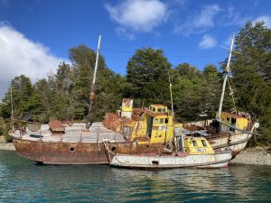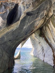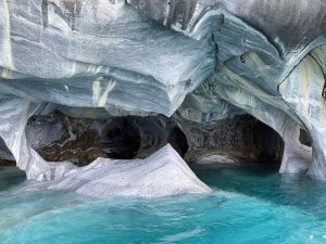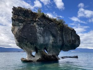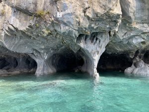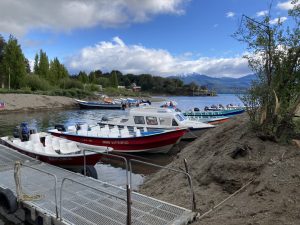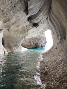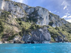 Nach dem Frühstück in der Hospedaje packe ich meine Sachen schonmal zusammen, um nach der Bootstour gleich weiterfahren zu können. Ich lasse mich doch zur langen Tour überreden (20 Buden bieten mehr oder weniger dasselbe zum gleichen Preis an, ich bekomme einen Discount für die knapp dreistündige Fahrt auf dem Lago General Carrera, der Tagesausflug zum Gletscher San Rafael kostet fast 200€). Baden ist offiziell verboten, aber bei 10-12 Grad Wassertemperatur das ganze Jahr über kommen nur wenige auf diese Idee. Der Guide erzählt über die Geschichte der Region. Von Bergbau ist ein altes Schiffswrack übrig, das die Minendörfer am See versorgt hat. Reiche Chilenen haben Wochenendhäuser am See. Attraktion der Gegend sind die ausgewaschenen Marmorfelsen am Ufer, die zum Teil Höhlen bilden. Sie gibts hier an mehreren Stellen, zwei davon sind besonders markant. Das eine ist die Capilla de Marmol, das andere die Catedral de Marmol. Bei Lonely Planet gehört das zu den Top 10 Chiles. Allerdings hätte definitiv die kurze Tour gereicht. Zurück ging es gegen Wind und Wellen, die vorher ausgeteilten Regenponchos waren nützlich. Damit kam ich erst nach 12 Uhr los. Die Piste war nur mässig, und anfangs gabs wieder viele sinnlose Steigungen. An sich kann man zum Tagesziel Puerto Bertrand mit dem Boot fahren. Nach der zweiten Pause und über 4 Stunden hatte ich immer noch 18km und 400hm vor mir, als am südlichen Seeende ein Schild u.a. mit Camping auftauchte. Bin sofort abgebogen und habe einen sagenhaften Ausblick gehabt. Der Eigentümer hat mir alles gezeigt, vom 3* Hotel mit Hot Tubs über den Strand mit Kajaks, die privaten Cabanas, das Refugio, das Wäldchen für die Zelte, den Aufenthaltsraum und den 2km langen Rundweg um das Gelände. Statt Instantnudeln werde ich heute Abend das 3 Gänge Menü nehmen. Echt gut, dass ich mich heute nicht noch 2 Stunden länger gequält habe.