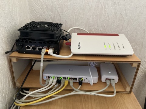Die Schalttafel war nicht das Optimum, ein selbstgeschnitztes Regal ist praktischer. Dem Topton musste ich noch einen Lüfter spendieren (von 60° auf 40° bei niedrigster Drehzahl), die Kühlrippen allein bringen wenig. Der Switch wird auch ordentlich warm, der sieht aber keine zusätzliche Kühlung vor.
