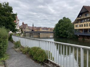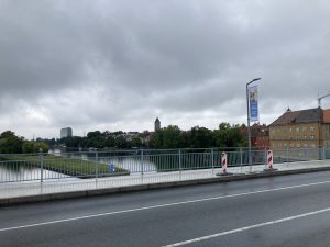 Wie angekündigt, gab es leichten Regen ab dem frühen Morgen. Gefrühstückt habe ich deswegen bequem im Zelt. Eine Regenpause kurz vor 9 Uhr habe ich dann zum Packen genutzt und bin los. Nieselregen war dann der Begleiter. Der vorgeschlagene Weg nach Schweinfurt endete an einer Fähre, die ausser Betrieb war. Also gings weiter auf und neben der Landstrasse ausser Sicht des Main. Den habe ich erst in Schweinfurt überquert, das dortige Museum ist mir bekannt. Prickelnd war die Gegend nicht, auch die Dörfer sind durch die Bahnlinie vom Fluss getrennt. In Haßfurt gings durch den Ort und den McDonalds im Industriegebiet habe zur Mittagsrast genutzt. Da ich alles aufgegessen habe, hörte der Regen erfreulicherweise auf. In Zell habe ich die nächste Mainquerung verpasst und bin weiter entlang der Landstrasse Richtung Bamberg. Kurz vor Bamberg war bei Stromkilometer 384 die Mündung zum Main-Donaukanal erreicht. Entlang des Kanals und der Regnitz gings dann durch Bamberg, der hübsche Campingplatz ist ziemlich ausserhalb im Süden, also muss ich morgen wieder ein ganzes Stück zurück zum Main.