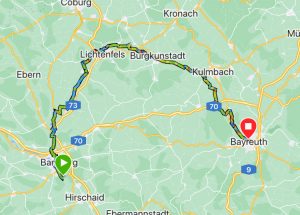 Heute war ich schlapp, war viel zu lange unterwegs. Ok, erstmal gings ohne Frühstück den steilen Hügel zum Bamberger Dom hoch (leider keine Aussicht, dazu hätte man auf einen Turm klettern müssen), dann durch die verwinkelte Altstadt zum nächsten Lidl für Frühstück. Die erste Hälfte der Fahrt war nicht hübsch und gegen den Wind, viele Richtungswechsel und den Main nur bei Überquerungen gesehen. Irgendwann wurde die Gegend schöner, wies aber einige fiese Steigungen auf. Vor Burgkunstadt hatte das Schaltwerk Probleme, aber Ölen der Kette nach 470km und dem Regen gestern war offenbar die Lösung. Kulmbach sah ich nur von weitem, bei der Querung des Weissen Main (geht hoch ins Fichtelgebirge) war das Schild für den Zusammenfluss in 2,6km (dumm geplant, hätte einen deutlichen Umweg bedeutet), dafür ging es dann in Sichtweite des Roten Main weiter. Bundesstrasse zeigte irgendwann 13km, der Radweg 15km bis Bayreuth, aber auf den Autoverkehr habe ich doch verzichtet. Da es auch im weiteren Umkreis von Bayreuth keine Campingplätze gibt, habe ich mir eine Hotelübernachtung gegönnt, Rad steht in der Tiefgarage. Die Kraft hat nur noch für einen Gang in die Altstadt gereicht (zwei Maisels Weizen waren gut, die Grillplatte sehr mässig), der Grüne Hügel zu weit zu Fuß.