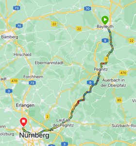 Erholt nach bequemen Hotel und mit ordentlichem Frühstück geht es mit frischer Kraft den Rest des Roten Main nach Süden. Ich komme doch am Grünen Hügel und der Villa Wahnfried vorbei, bevor es durch eine schöne Wald- und Wiesengegend geht. In Creussen überquere ich den Roten Main, der hier nur ein Bach ist und nur ein paar Kilometer weiter westlich entspringt, ein letztes Mal. Dann geht es weiter bergauf, bevor die Pegnitz nach Süden beginnt. Die sehe ich aber erstmals in Lauf, wo sie schon eine beachtliche Breite hat. Erst die letzten 10km nach Nürnberg hinein gehen entlang einer Bundesstrasse. In Nürnberg mache ich eine kleine Stadtrundfahrt, bevor ich entlang der Pegnitz nach Fürth radel. Dort treffe ich mich mit einem Arbeitskollegen, wo ich nach einem Biergartenbesuch wieder bequem auf einer Couch übernachte.