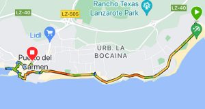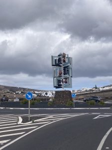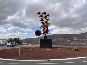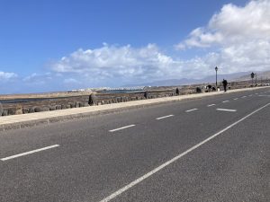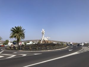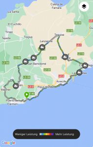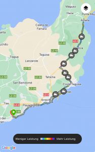Zum ersten Einrollen wähle ich den Weg nach Norden an der Strandpromenade Richtung Arrecife am Flughafen vorbei. In Playa Honda geht es kurz über Anwohnerstrassen mit einem fett eingemalten Radweg und dann wieder am Meer entlang. In Arrecife wird einer Baustelle ausgewichen, dann geht es weiter auf einem neuen Radweg nach Costa Teguise. Die Strasse nach Norden ist neu asphaltiert, die Steigung ist immer noch da. Weiter nach Norden geht es auf der alten Landstrasse. Dann gehts durch Guatiza (Kakteenpark ist gut besucht) und Mala auf die Landstrasse nach Arrieta. Am Kreisel mit dem Windspiel Veleta wende ich und habe jetzt Rückenwind. Nach Costa Teguise runter gehts mit über 60km/h, rollt wirklich gut. In Arrecife gehts am IKEA vorbei, etwas verwinkelte Altstadt und dann wieder auf die Strandpromenade. Am Flughafen sind jetzt mehr Leute unterwegs, also etwas aufpassen auf dem schmalen Rad- und Gehweg. Es waren einige Radler unterwegs, hab sie heute alle überholt. Der Plan mit 3 Stunden hat perfekt geklappt, morgen gehts in die andere Richtung.