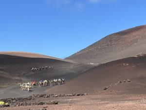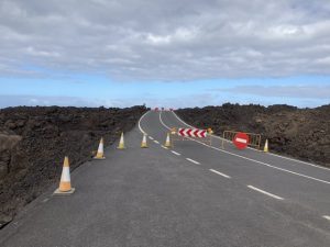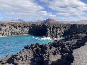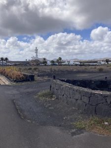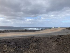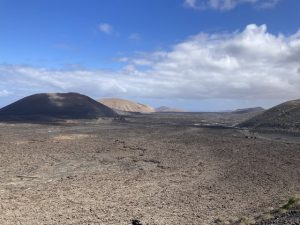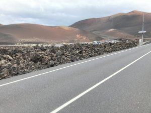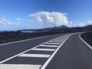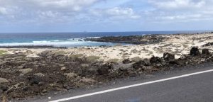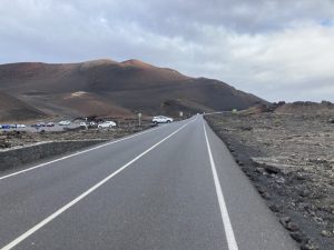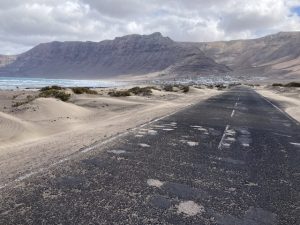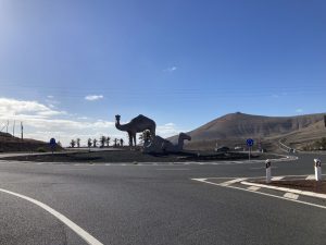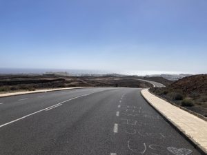 Nach einem kurzen Irrweg am Hafen von Puerto del Carmen finde ich die Landstrasse nach Puerto Calero, wo ich die steile Strasse zum Hafen herunterrolle. Dann gehts hoch zur Landstrasse Richtung Uga und am Kamelkreisel vorbei nach Yaiza. Im Kreisel unten mache ich eine Extrarunde, bevor ich weiter nach El Golfo fahre. Oberhalb halte ich kurz für ein Bild, dann gehts (sinnlos) den Hügel runter zu den Wellen. Schliesslich radel ich bis zur Strassensperre in Los Hervideros. Der Aufpasser konnte nicht sagen, ob die Strasse irgendwann verlegt wird, es wäre ehrlicher, den Weg richtig zu blockieren (2021 hat sich ein durch die Brandung verursachtes Loch neben der Strasse aufgetan und bevor da ein Bus reinfällt, wurde die Strasse gesperrt, ohne ernsthaft eine Reparatur oder Verlegung in Erwägung zu ziehen). Nun ging es gegen den Wind bergan Richtung Feuerberge. Bis Mancha Blanca war das echt übel. Immerhin war der Rest der Strecke ok, nur ein Triathlet hat mich überholt. In Tias musste ich kurz das Navi konsultieren (an derselben Stelle der Autobahn hatte ich vor 11 Jahren schonmal gestanden), dann gings geführt runter zurück nach Puerto del Carmen. Durch Steigung und Wind war der Schnitt miserabel, gestern war ich aber müder nach der Fahrt.