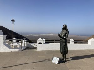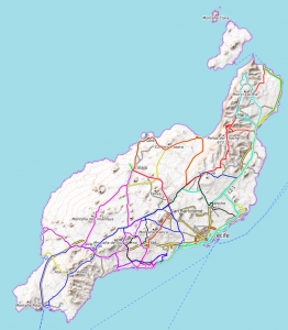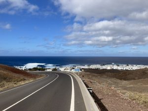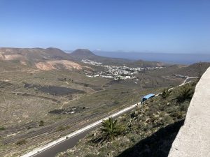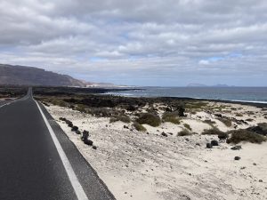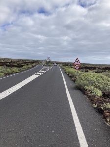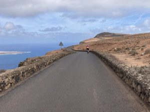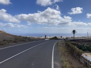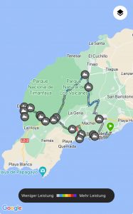 Zum dritten Mal nacheinander fahre ich durch Teseguite. An der Kreuzung Richtung Mirador del Rio schaue ich auf die Uhr und setze den Aufstieg gegen den Wind (heute 25-45km/h) fort. Es läuft gut bis zur Radarstation. Die Abfahrt nach Haria und die folgenden Wellen über Maguez und Ye hoch zum Mirador sind auch kein Problem heute. Ich brauche 1,5h für die 23km, die mir vorgestern gefehlt haben. Den Höhengewinn nutze ich anschließend, um gegen den Wind nach Orzola zu rollen. Entlang der Küste werde ich dann wieder vom Wind geschoben. Auf der mittlerweile üblichen Route am Monumento und Macher vorbei gehts zurück. Kurz überlege ich, bis La Geria und Uga zu rollen, um nochmal die Feuerberge hoch zu fahren, lasse es dann aber doch gut sein für heute.