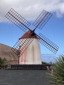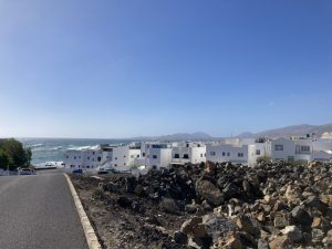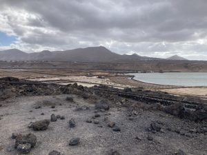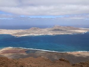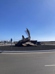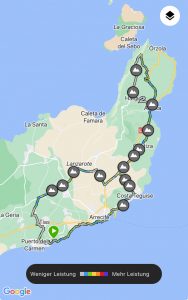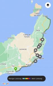 In Costa Teguise passe ich nicht auf und fahre am ersten Abzweig nach Guatiza vorbei, weshalb ich beim zweiten Abzweig mit 35hm extra belohnt werde. Das Windspiel erreiche ich 10 Minuten früher als letztes Mal, also ist der Wind nicht ganz so stark. An der Languste vorbei gehts bis nach Orzola, wo die Fähre nach La Graciosa auf Fahrgäste wartet. Ich fahre mit Rückenwind dieselbe Strecke zurück, die alternative Strecke bis Arrieta hätte knapp 300hm, die ich mir spare. Obwohl Garmin mittlerweile eine tiefrote Überbelastung anzeigt, fühle ich mich mittlerweile ganz passabel. Morgen soll wenig (20km/h) Wind sein, also gehts wieder aufs Rad.