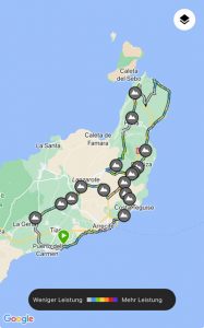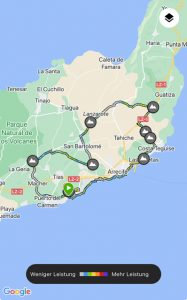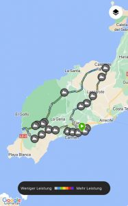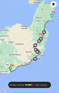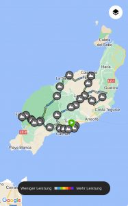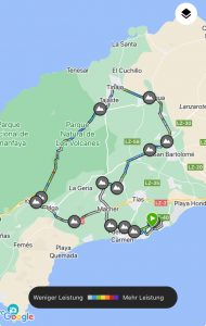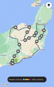 Garmin hat wieder zu einer Ruhepause geraten, aber den Tag mit mäßigem Wind (25km/h) wollte ich nicht ungenutzt lassen. Auf dem Weg nach Macher war mir aber klar, dass es besser keine lange Runde wird. Daher bin ich am Kamelkreisel nicht wie angedacht nochmal hoch nach Femes sondern gleich weiter nach Yaiza und dann die Feuerberge im Gegenwind hoch. Immerhin habe ich zwei Mountainbiker überholt. Diesmal bin ich links nach Tinajo und erst dann wieder nach San Bartolome und Conil. Dort habe ich noch einen Schlenker über Tegoyo nach Macher gemacht (sehr hübsche Nebenstrecke mit Blick auf Fuerteventura), um wenigstens auf 3 Stunden zu kommen. In Puerto del Carmen hat mich ein Holländer angehalten, der das erste Mal mit einer elektrischen Schaltung auf einem Leihrad unterwegs war und sich nicht hat zeigen lassen, wie man das Kettenblatt vorne wechselt. Wusste ich natürlich auch nicht, aber ein Youtube Video hat das Geheimnis gelöst (bei SRAM beide Schalter gleichzeitig betätigen). Morgen ist wieder Wind bis 75km/h vorhergesagt, also mache ich Ruhetag.