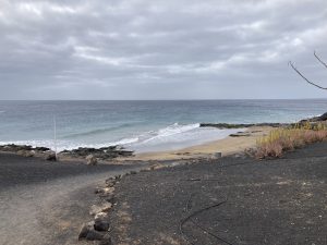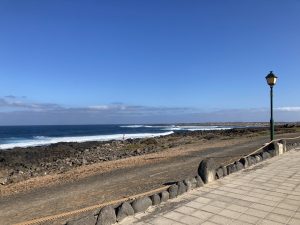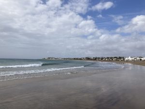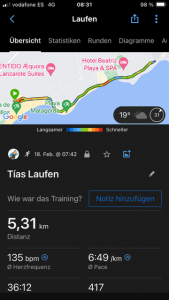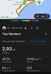 Sturm bis 65km/h hat mich trotz blauen Himmels im Hotel bleiben lassen. Durch den Wind war es noch nicht mal in der Sonne auf der Terrasse angenehm. Garmin hat zwar weiterhin Ruhepause empfohlen, mittags bin ich aber doch eine kleine Runde gelaufen. War ein Fehler, keine Brille aufzuhaben, stellenweise kam der Sand auch ins Gesicht geflogen. Die wenigen Radfahrer sahen auch nicht glücklich aus, eine Gruppe Engländer hat am Flughafen gewendet, statt Richtung Arrecife weiterzufahren.