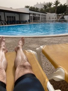 Nach einem Spaziergang entlang der Strandpromenade habe ich am Ruhetag doch etwas Sport gemacht. Durch den Wind und die Bewölkung war es am Hotelpool ziemlich leer (ist auch ungeheizt, bestenfalls 18° heute). Also bin ich im Neopren und Badekappe rein und hab es tatsächlich eine Stunde im Wasser ausgehalten. Bei 17m Länge war häufig zu wenden, hat am Ende ziemlich genau 3km ergeben. Meer wäre etwas wärmer gewesen, aber bei dem Wellengang hätte es wenig Spaß gemacht.