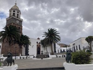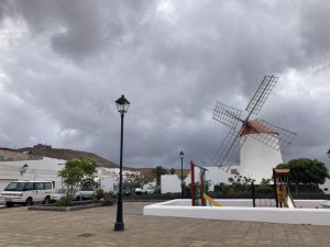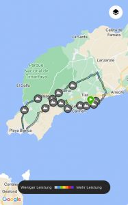 Heute geht es wieder am Flughafen vorbei über Arrecife und nach Costa Teguise den Berg hoch. Kurz vor Guatiza gehts es an der versteinerten Stadt vorbei weiter hoch nach Teguise mit etwas Sightseeing. Es regnet tatsächlich mal für 5 Minuten. Dann geht es wieder flott zum Monumento del Campesino runter. Diesmal biege ich links ab Richtung Arrecife und dann wieder den Berg hoch über Güime, einem weiteren Windspiel, Montana Blanca und Masdache. Dann bin ich wieder auf der Strasse Richtung La Geria. Nach dem letzten Anstieg bis La Asomada gehts es über Macher runter nach Puerto del Carmen. Ich fahre nochmal gegen den Wind ganz aussen rum. Der Ruhetag scheint gut getan zu haben, laut Garmin hat sich die Form weiter verbessert und ich hätte noch Kraft für die gleiche Runde gehabt.