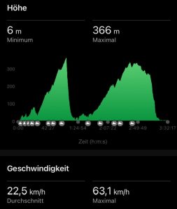 Bei Wind von 30-55km/h gehts wieder nach Norden. Nach 1h50m bin ich in Arrieta, das Windspiel ist abgebaut (wahrscheinlich umgeweht). Dann gehts hoch zum Mirador del Rio, oben bläst es besonders heftig. Immerhin feuert mich die Parkplatzwächterin auf den letzten Metern an. 172W habe ich im Schnitt auf dem Hinweg getreten. Kurz geniesse ich die Aussicht auf La Graciosa, dann gehts wellig nach Maques und Haria, wo ich kurz den Hauptweg verliere. Dann kommt die schöne Abfahrt nach Arrieta und mit Rückenwind zurück. Ich biege nicht ab nach Costa Teguise, sondern fahre weiter nach Nazaret und San Bartolome. Die Strasse wurde erfreulicherweise auch neu gemacht, war früher echt übel. Über Conil und Tias gehts zurück ins Hotel. Jetzt habe ich praktisch alle Punkte der Insel abgefahren, nun folgen Wiederholungen.
