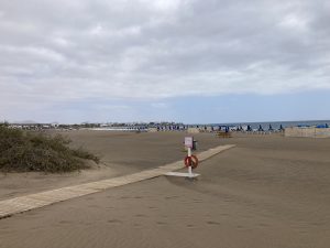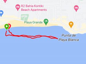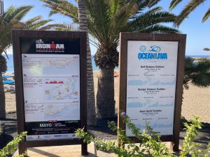 Sogar bis zum westlichen Ende der Playa Grande sind es entlang der Promenade 30hm auf 3,5km. Zu Beginn der einsetzenden Flut streife ich den Neopren über, wobei ich darauf achte, nicht zuviel Sand in den Anzug zu bekommen. So sind die 20° im Wasser ganz angenehm. Ich schwimme etwas aus den Wellen und biege dann parallel zum Strand ab, etwa auf Linie der offiziellen Schwimmstrecke des Ironman. Der Sand unter mir ist recht öde, kleine Fische, darunter Flundern, beleben etwas die Szenerie. Atmen geht gut zu beiden Seiten, auch das auf und ab im Seegang stört nicht besonders. Es sind noch ein paar Triathleten unterwegs, allerdings nicht in meiner Nähe. Nach 20min und 900m wende ich, im Meer bin ich etwas langsamer unterwegs als im Schwimmbad. Auch der Rückweg mit dem Wind ist nicht schneller. 3,8km wären hier machbar, aber Bestzeit ist nicht zu erwarten. Beim Ironman ist der Cutoff bei 2h20m, ich denke, mit 1h20m wäre ich dabei. Nach den Erfahrungen jetzt würden dann aber selbst mit wenig Wind 7-8h auf dem Rad folgen. Der Marathon wäre dann flach 3x bis Playa Honda und zurück, es blieben also über 7 Stunden bis zum finalen Cutoff von 17h. Das tue ich mir keinesfalls an.