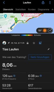 13 Mal war ich mit dem Rad unterwegs, insgesamt knapp 55 Stunden und 1220km mit über 15.000hm. Strecke und Dauer haben arg unter dem Wind gelitten, das waren nicht allein die Höhenmeter. Allzuviele Strassen habe ich nicht ausgelassen, einige waren für Radler sowieso gesperrt und durch Arrecife macht auch wenig Spaß im Verkehr. Windarme Tage kommen vielleicht in der zweiten Märzhälfte, aber die Wettervorhersage hat sich auch in meinen 3 Wochen ein paar Mal zum Schlechteren geändert. Trotzdem bin ich zufrieden, die Form ist angestiegen und den Sonnenschein zusammen mit so gut wie keinem Regen hätte ich daheim nicht bekommen. Laufen und Schwimmen waren eher nur Zeitvertreib, bei allem zusammen hätte ich nicht so oft fahren können. Das muss ich mir zuhause dann wieder anders einteilen. Ich freue mich schon auf lange Radeinheiten ohne Wind und Steigungen. Schwimmen im Meer hat schon etwas, aber wirklich nützlich für meine typischen Wettkämpfe ist es nicht.